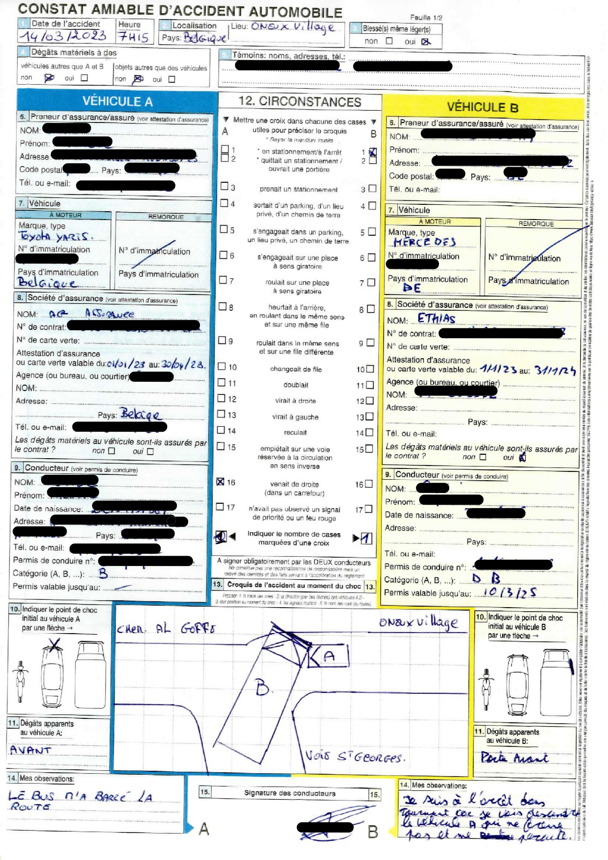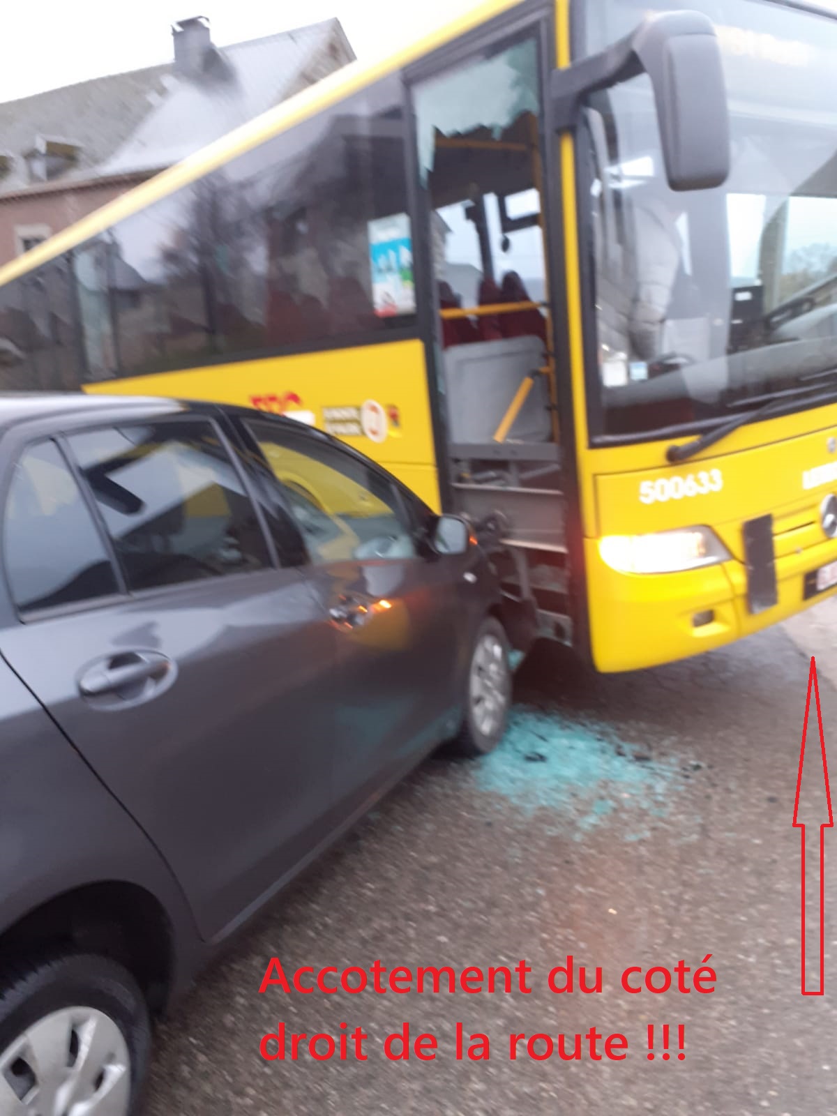 Après avoir proposé un partage de responsabilités 50/50, la compagnie d'assurances RC du véhicule B (autocar) a fini, sans qu'il ne soit nécessaire de procéder par la voie judiciaire, par reconnaitre la pleine et entière responsabilité de son assuré.
